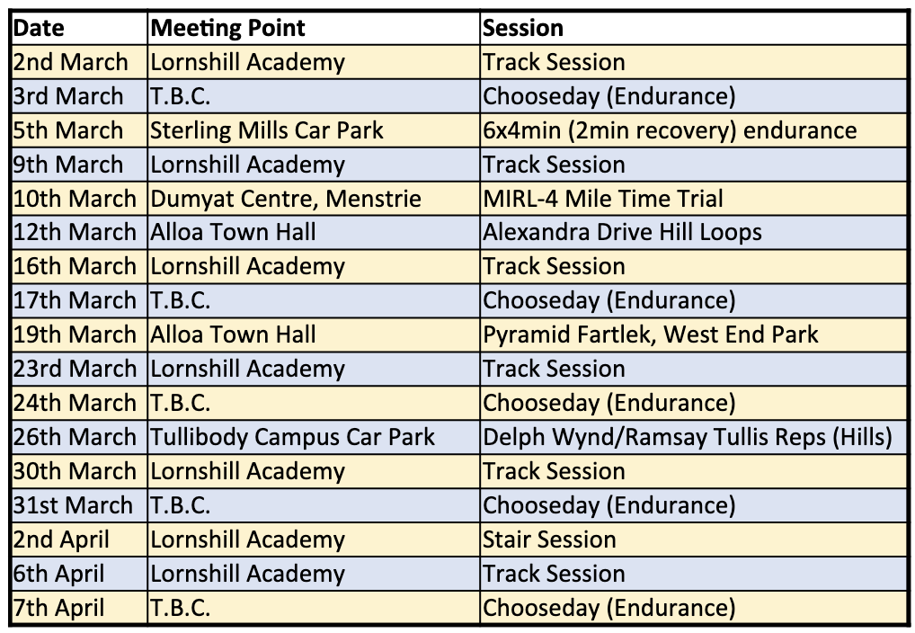 Mondays: 7pm start time at the named meeting point. 30 minute session for speed training. Please arrive warmed up and ready to run.