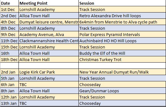 Monday is half hour track session, warmed up ready to start at 7pm. Other sessions are 6.30pm unless indicated otherwise.